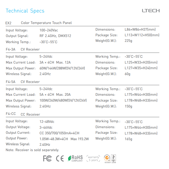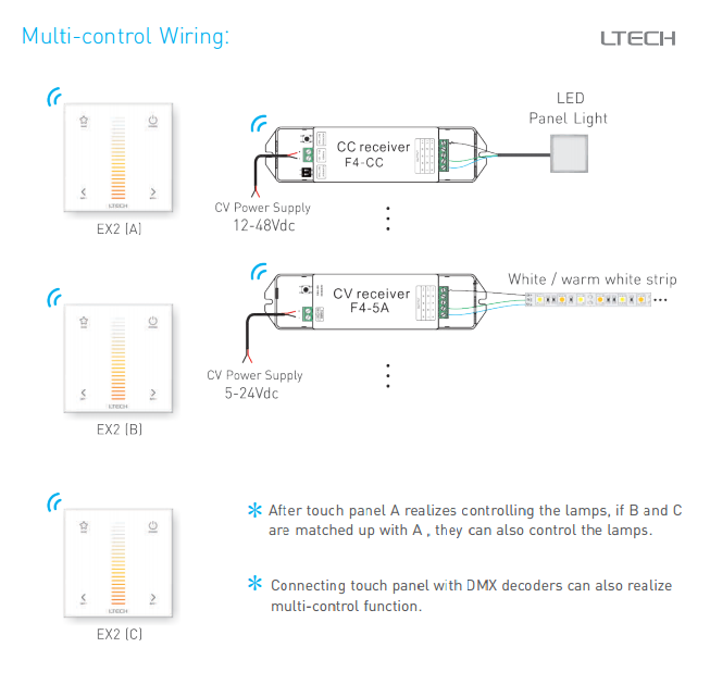 Ltech EX2 Color Temperature 2.4G RF DMX512 Touch Panel Controller is durable and popular for LED Lighting decoration, For big order or customized items of LED Strip, LED Controller, LED Power Supply and Other LED items, Pls feel free to contact service@agodx.com